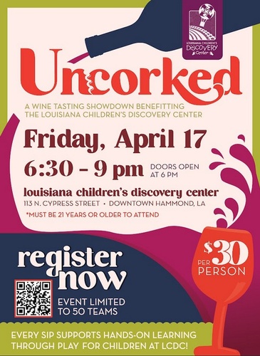 The Louisiana Children’s Discovery Center is the only children’s museum in our parish, welcoming kids from across the region to learn through hands-on play. Our mission is strong, but we must rely on community support to keep it alive. By joining us at UnCorked, you’re not just tasting great wine—you’re investing in our children’s future and helping the Discovery Center thrive for years to come.